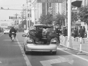 1月30日是春运第一天,当天11时许,一辆安徽亳州的出租车,后备厢内塞满大大小小十几个行李包。该车沿鹿邑县城紫气大道由东向西行驶,由于怕被交警查,出租车一会儿在快车道行驶,一会儿又驶入人行道,与附近执勤交警打起了“游击”。晚报记者 侯国防 摄