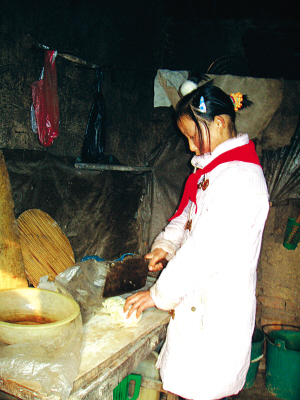 6岁的孩子能干什么?他们大多在父母的呵护下高兴地上幼儿园、逛公园、玩玩具。而6岁的惠珍虽不及锅台高,就会站在板凳上打稀饭、炒菜。8岁的孩子又能干什么?他们大多在上小学,课间会结伴嬉闹做游戏,放学后会等着母亲端上热腾腾的饭,而8岁的惠珍却要在课间跑回家为父亲擦屎刮尿、喂开水,放学后也要跑回家为全家人做饭(图二)、洗衣服,每天夜里至少起床两次为父亲翻身,扶奶奶下床方便……