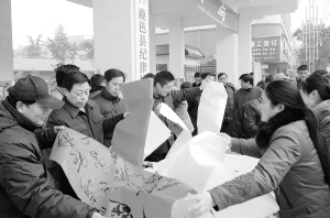 昨日上午,鹿邑县县委大门前,几名当地书法家正在为市民义写春联。春节前夕,鹿邑县文联特意组织当地知名度较高的6名书法家为广大群众义写春联。晚报记者 侯国防 通讯员 蒋保庆 摄