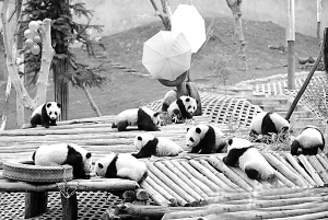 2月3日,大熊猫宝宝在大熊猫幼儿园玩耍。当日上午,卧龙中国保护大熊猫研究中心2009年繁育成活的16只大熊猫搬进了大熊猫幼儿园集体宿舍。至此,中心2009年出生的大熊猫宝宝全部正式断奶,离开各自的妈妈,开始了独立生活。新华社发