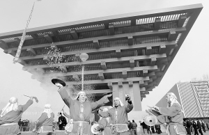 2010年上海世博会标志性建筑中国馆“东方之冠”8日正式竣工。极富中国建筑文化元素的“斗冠”造型以及表面覆以“叠篆文字”的主题构思,令矗立于黄浦江畔的中国馆淋漓尽致地呈现出中华神韵。图为竣工仪式现场。新华社发