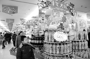 超市里装饰用的大红灯笼随处可见,各式年货的销售专区供市民自由选择,不少食品被装进大红色的喜庆包装袋,瓜子、糖果类零食堆积如山……“我们已推出各式各样的促销活动,走亲访友的礼盒类产品比较畅销。”一家超市的工作人员告诉记者,目前的销售量较往常有了很大幅度的提高。