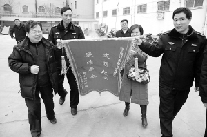 昨日上午,周口师范学院基建人员来到周口市规划监察大队,送上一面写着“文明执法 廉洁奉公”的锦旗,感谢规划监察人员的热情服务、文明执法。据了解,2009年,周口市规划监察大队先后被省评为优秀单位和达标先进单位。