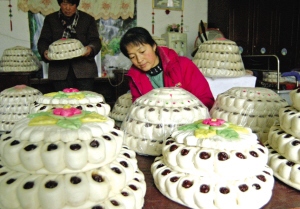 鲁西地区有春节蒸花糕的习俗,当地农民用红枣和面粉制成塔形的花糕,顶部再装饰上彩色的花形面饼,寓意人们的生活“年年高”。新华社发