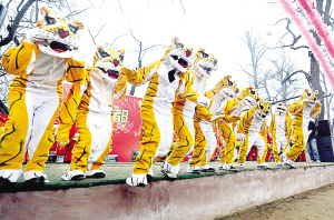 2月9日,在郑州商都民俗庙会内,一群“小老虎”从舞台上跃下,准备与游客进行互动。2010年农历是“虎年”,河南各地的一些民间文艺团体纷纷挖掘“虎元素”,打造“虎文化”,以求在春节期间的表演中抖起“虎”精神,上演一幕幕“虎跃中原”的好戏。 新华社记者 王颂 摄
