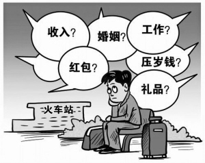 那么,“恐归族”过年的压力来自何方呢?归纳起来大致有这样几种:一恐“春运”太可怕。不论是天上的,水上的,还是陆地的,交通工具这时都显得“捉襟见肘”,不但人多受罪,价钱也会较平时高,有时需要托人才可弄到紧俏票。有些人已经形成心理障碍,想起“春运”的奔波之苦心里就发怵。二恐“红包”无底洞。一年辛苦挣得的钱,从银行中取出,也许还没有暖热,就要以“红包”形式派发给数都数不过来的“七大姑八大姨”等亲戚朋友们。而且“红包”数额逐年看涨,让许多工薪阶层心生怯意。三恐人情债太多。有些地方风俗不能随时代的变化而改变,礼节繁杂,饭局车轮战更是一个“累”字了得!四恐攀比受不了。回到家,见到亲戚朋友,难免问起哪里高就啊?如何发财?成家了没有?这些问题照实说吧,恐自己脸上不好看,又扫了人家的兴;不照实说呢,紧接着可能就会“红包”“出血”,让人左右为难。尤其是,有些游子给父母撒了一个善意的谎言,说自己在外一切都好。可事实上并不尽如人意,回家则担心“美丽的谎言”“穿帮”、“露馅”,所以,一年一度的盘问,仿佛轮回式的“梦魇”……