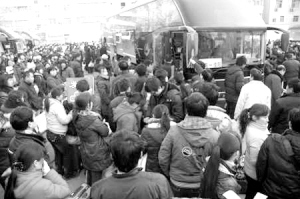 2月19日,在淮阳县长途客运汽车站,外出务工的农民工们扛着行李准备登车。当日是大年初六,淮阳长途客运汽车站迎来了节后农民工出行的客流高峰,汽车站开辟农民工“绿色通道”和“农民工专车”,不让农民工排队买票,让每一名农民工都有车坐,顺利出行。晚报记者 杜欣 摄