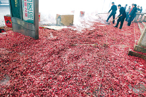 20日,大连街头商户燃放“开门炮”后,道路上留下厚厚的爆竹废屑。当日是春节长假后开工的第一天,大连市的单位和商家纷纷在自家门前马路上燃放“开门炮”求吉利。由于商家燃放“开门炮”的时段和地点过于集中,造成大连市部分繁华路段人车难行,烟雾满天,并留下大量的鞭炮废屑。据当地环卫部门估算,仅当日上午,大连环卫部门就清理出近千吨的鞭炮废屑。新华社发