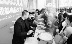 20日,在成都元宵商品交易会开幕式上,组委会和企业联手推出10万个汤圆免费吃活动,让成都市民提前感受元宵节的气氛。 新华社发