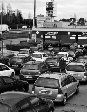 下图:2月22日,法国西部圣埃尔布兰的一个加油站外等待加油的汽车排起长队。法国道达尔石油公司名下6家炼油厂工人近日因担心北部敦刻尔克一家炼油厂遭关闭举行罢工。随着罢工活动愈演愈烈,法国部分加油站出现“油荒”。新华社发