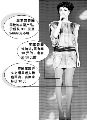其中,最热门的搜索产品正是王菲的一身行头。标注“王菲春晚同款Elizabeth and James真丝连衣裙”的产品,价钱从300元至24999元不等;“王菲春晚首选连裤袜”,既有卖10元的,也有卖35元的;“春晚王菲行头之甜美迷人粉色甲油”,“春晚王菲行头之高跟鞋”也纷纷向网友招手,就连“与王菲春晚同衣服花色的小丝巾”也来凑热闹抢眼球。难怪有网友戏称,王菲春晚演出是一次成功的代言!