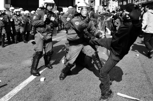 新华社记者看到,在雅典市中心的示威行动基本上是平和的,示威群众在议会大楼前高呼口号抗议政府的紧缩政策。只有极少数人与警察有轻微冲突,警察用催泪瓦斯驱散人群,没有人员受伤。
