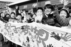 3月1日,同学们参加“牵手成长 放飞梦想”开学第一课活动。当日是天津中小学开学第一天。在天津和平区昆明路小学开展的“牵手成长 放飞梦想”开学第一课活动中,学生和家长代表组成“牵手”小组共同印证以“一个孩子带动一个家庭,服务社区,传递爱心”为主题的牵手公约。新华社发