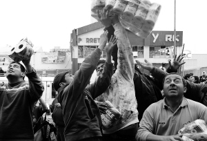 地震发生以来,当地处于断水断电和缺少食品的状态,市民们已经开始产生恐慌情绪,发生了哄抢超市和食品店的事件(如右图)。