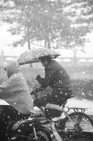 立春已过一月,可中原大地始终没有暖和起来。昨天,一场“桃花雪”降临我市,给初春的市区带来一些寒意。图为市民在滨河路上冒雪前行。 晚报记者 朱海龙 摄
