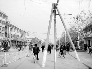 鹿邑县真源大道南段道路护栏东侧,三根水泥线杆呈“三足鼎立”状,车辆和行人通行很不方便,也存在安全隐患。