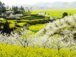 推荐理由:贵州省贵定县的音寨村是一个有着600多年历史的布依山寨,这里民风淳朴,房前屋后山坡上种植了许多李树。每到春季,从音寨极目四望,远山近峦,纯洁雪白的李花与音寨瓮城河两岸满田满坝盛开的金黄色油菜花交相辉映,形成了“金海雪山”的奇观。