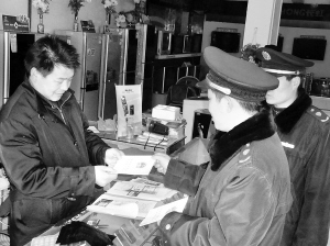 3月8日下午,扶沟县工商局执法人员给扶沟县大新镇个体户叶百艳发放维权手册。为提高消费者维权意识,扶沟县工商局针对近几年来易发生的侵权投诉热点、难点问题编印了《消费维权手册》,向消费者免费发放2万余册。晚报记者 金月全 摄 线索提供 卢付昌