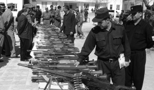 3月8日,阿富汗巴格兰省首府普勒胡姆里市警方向媒体展示反政府武装人员上缴的48件武器。