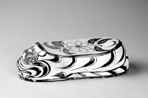 枕始见于隋唐,一般由枕面、四壁和枕底构成。枕面前低后高,枕内中空。其种类有青瓷枕、白瓷枕、绞胎枕、三彩枕等,宋元时期又出现了兽形枕、建筑枕和人形枕。早期的枕外形较小,宋元时期枕较大。为防止烧造变形,一般在枕的后壁或底部开有出热气的孔,这就解释了为什么虎形枕的虎鼻孔为两透孔,原来是工匠们专门留来用于施放枕内热气的。这样巧妙的设计既保证了枕的完美,又体现了古代工匠的智慧。