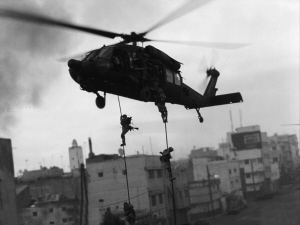 左图为真实再现1993年美国在索马里军事行动的著名电影《黑鹰坠落》的剧照。该片叙述美军在摩加迪沙执行重要抓捕任务时,由于准备不充分和情报错误,导致行动陷入混乱,两架美军160特种航空团的UH60“黑鹰”直升机被先后击落坠毁,幸存成员陷入民兵的包围,抓捕行动随即变成拯救行动。美军此后在1994年被迫撤离索马里。于是在美国,“黑鹰坠落”也成为了失败的代名词。新华社发