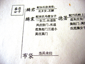 蒋德玉是一位70多岁的老人,在蒋寨街上做生意已有几十年了。见到我们,来不及寒暄,他就拿出一本有些破旧的厚书。这是一本族谱,书名为《汾左蒋氏族谱》。他熟练地翻开,肯定地说:“这就是你们要找的蒋林布,他的亲人全在这儿。”按照他的指点,我们看到,这一家兄弟三人。老大:蒋麟君,老二:蒋麟震,老三:布袋,当兵未归。不过,我们并没有见到“蒋林布”3个字。蒋德玉似乎看出我们心中的疑虑。他充满自信地说:“布袋,是小名,他当兵未归,麟又是他的辈分,在部队用的可能就是蒋林布一名。”