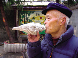 我们就要离开蒋寨时,蒋德玉无意中说起他还珍藏着一件“宝贝”。我们提出看一下。在蒋德玉家,老人从里屋拿出一个大大的海螺,白中泛黄,足有30厘米长。他走到院里用劲吹起来:呜——呜——雄浑中带有古朴,响了将近20秒。哪儿来的海螺?蒋德玉不紧不慢地说:“从1943年开始,八路军某部3营7连在蒋寨驻扎有一年多,他们都穿着灰衣服,帽上缀有两个扣子。连长姓杜,很喜欢小孩。过年的时候,杜连长还给村里小孩买鞭炮。部队走的时候,留下了这个海螺。”蒋德玉从那时一直保存到现在,很是爱惜,因为,他父亲当年就是为这支八路军部队送信时失踪的,近70年了,一点音信也没有。蒋德玉说:“这个螺号吹起来能传十多里远,以前生产队大集体时作用可大了。村里交公粮,下地干活,都吹它,村民一听就行动,可管事儿了。”