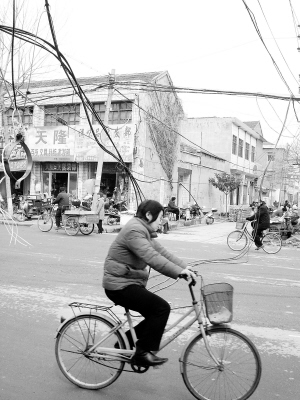 记者在现场看到,6根手指粗的光缆垂落在地上,正好拦在文化路中间,摩托车、自行车等小型车辆可以勉强通过(如图),其他车辆只能绕行。