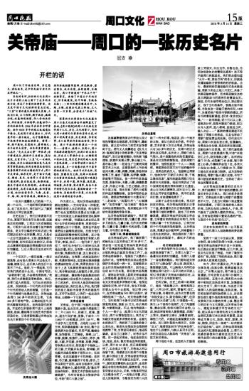 一个旧瓦片、一座旧城墙、一座古建筑等,在有些人看来只不过是瓦片、城墙、建筑而已,在后来人的生活中也算不了什么。是的,乍一看起来,它们对我们真的没什么用。中国有句话:“会看的看门道,不会看的看热闹。”我想,我们大多数都是看热闹的。然而,在看门道人的眼里,它们从历史深处走来,反映的是一个时代的文明和那个时代的劳动人民的智慧,它们是一个时代辉煌与沧桑的见证。关帝庙就是周口300多年前的见证者,它是300多年前的产物,从建成起至今,历经风霜雪雨的洗礼,变的是朝代的更换,不变的它所留给周口这片土地的建筑、绘画、雕刻等方面的艺术价值和那段历史,后来者都能通过关帝庙这张名片来看那个时代的足迹。