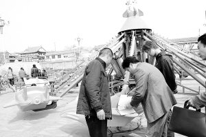 淮阳又将迎来一年一度的传统古庙会——“二月会”。为保证庙会期间的游客安全,昨日,市质监部门联合淮阳质监部门对淮阳县城的游乐设施进行集中安全监察,确保在用特种设备运行安全。图为市质监局特种设备安全监察人员在对淮阳太昊陵景区内的游乐设施进行安全检查。