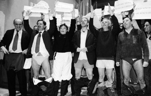 意大利罗马约50名左翼政党市政官员15日在市政厅以脱裤子方式呼吁尽快通过本市2010财政年度预算。新华社发