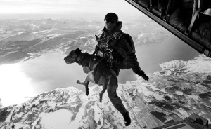 欧洲最大规模的特种部队跳伞演习近日在挪威举行。此次跳伞中,特种兵携带嗅探犬从一万英尺(约3048米)的高空往下跳。这只嗅探犬跳伞训练时它的嘴被保护器罩着,以防止它落地时受伤。新华社发