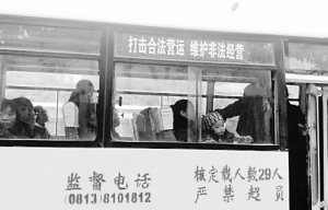 本报综合消息 四川自贡大安区的40多辆客运汽车,自发组织,齐刷刷在车身上贴出标语:“打击合法营运,维护非法经营”,被网友称为“自贡最牛标语”。为什么要正话反说?车主显得很无奈:“我们反着贴标语,只是为了引起重视。”据悉,车主们此举,是为抗议“黑车”非法经营。车主称,自贡开往牛佛的客运班车有40多辆,几乎都是经营惨淡;而“黑车”竟有上百辆之多,两方车主之间经常发生冲突。对此,相关部门称:“黑车”产生原因很多,“打击难、取证难、处理难”,要完全治理还需时日。(华西)