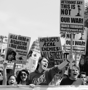 “不要侵略要就业”“战争等于恐怖主义”,各种反战标语集结成群。一些抗议者一边双手托举着用美国国旗包裹着的纸棺材,一边大声疾呼:“我们不要战争!”集会上,一群纽约大学生高喊:“不要战争,不要侵略!我们要工作,要教育!”