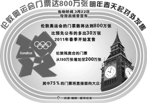 据介绍,伦敦奥运会的总门票数将达到800万张,比预先公布的多出30万张。伦敦残奥会的门票数也从150万张增加至200万张。其中75%的门票将直接面向大众,于明年春季开始发售。