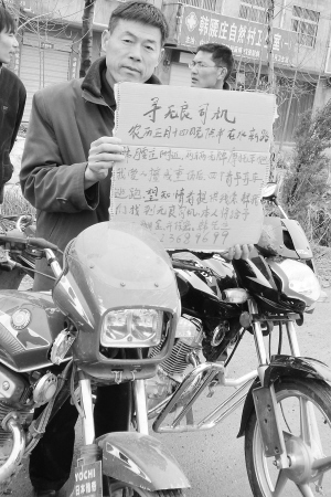 事故发生后,韩先生曾多次到交警部门询问案情进展,交警告诉他,因两辆摩托车都无牌照,查找起来比较困难。为能尽快找到肇事车主,韩先生自制了一块牌子挂在摩托车上,上面写有事故情况介绍,他决定用农用车拉着肇事摩托车到附近的几个村庄和集镇上寻找车主(如左图)。