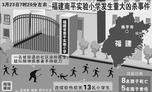 据实验小学校门口的监控录像显示,凶手郑民生从杀第一个孩子开始,到杀最后一个,总共用时才55秒钟。实验小学左侧凹进去的一小片空地是南平市体育局的大门,据监控录像显示,郑民生的屠杀是从这个地方开始。“他在这个地方杀了第一个孩子,然后一路杀进去,这里当时有几十个孩子,大点的还会四处跑开,低年级的吓得脚都软了,最后一个被杀的孩子是自己撞到凶手手上的。”一位南平当地官员向福建省公安厅领导介绍时说。