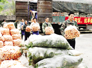 3月24日,广西凤山县灾区群众在卸运“爱心菜”。当日,广西农业厅将40吨“爱心菜”运到凤山县,免费发给灾区学校师生和各乡镇困难群众。持续的旱情使凤山农业生产受到重创,城乡蔬菜紧缺。新华社发 周恩革 摄