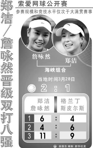 据新华社电 北京时间昨天,参赛规模和竞技水平仅次于大满贯赛事的索爱网球公开赛在迈阿密继续进行,在女双第二轮比赛中,海峡组合郑洁和詹咏然以2比1战胜南非的格兰丁和美国的斯皮尔斯,晋级8强。