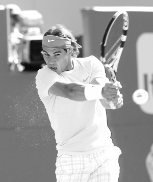 本报综合消息 索爱公开赛男单第四轮昨晨在迈阿密打响,纳达尔在对费雷尔的西班牙内战中艰难胜出,将与“法国阿里”特松加碰头。
