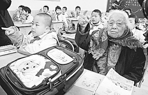 3月31日,在济南纬三路小学一年级一班教室,102岁的马秀贤老人与同学们一起上语文课。102岁的马秀贤老人家住济南市经二路社区,性格豁达、热情幽默、思维清晰,最大的遗憾就是没有上过学。当日,在社区和街道办事处的联系下,老人到济南市纬三路小学以“旁听生”身份上了一堂语文课,圆了她上学读书的心愿。新华社发