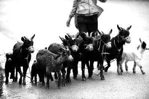 4月4日,一群戴着“口罩”的山羊走在广西大化瑶族自治县七百弄乡弄腾村里。近日广西一些地区喜降春雨,为防止山羊偷吃田里刚刚长出的庄稼,不少村民在放牧途中给羊戴上用竹子编成的“口罩”。新华社发