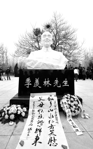 4月5日拍摄的憩园内季羡林先生的雕像。当日,我国著名学者、北京大学教授季羡林先生骨灰在亲属的护送下归葬故里山东省临清市康庄镇官庄村,完成了季羡林先生“睡在母亲身边”的遗愿。新华社发