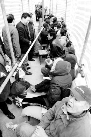 4月6日,排队者在棚内休息。青岛市市南区八大湖小区定于4月8日上午开始签订拆迁补偿协议,同时领取协议顺序号。为选房时挑选余地大,从4月3日上午开始就有拆迁居民来到拆迁办公室外排队,居民称连夜排队只为求得一套称心房。据了解,此次拆迁涉及拆迁居民1014户,由于地段好,周边房价不断飙升,绝大部分拆迁户都选择回迁安置。新华社发
