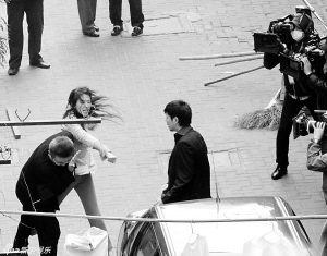 4月6日,由木村拓哉、筱原凉子及林志玲主演的日剧《月之恋人》在上海取景拍摄。记者在片场拍到林志玲与恶徒搏斗被打的场面。