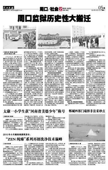 4月10日上午,数十辆大巴车载着600多名服刑人员,在200多名荷枪实弹的武警和监狱干警的押送下,离开周口监狱三监区,穿过西华县艾岗乡、红花镇、城关镇,开向位于西华县城东北方向三公里处新建成的中心监狱,这次搬迁标志着河南监狱关押点高度分散历史的终结。