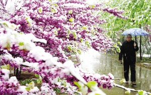 当日,一场雨夹雪突袭河南洛阳,积雪和低温给正在生长中的花草树木带来不利影响。