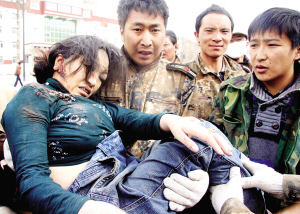 4月14日,当地民兵在救援受伤群众。青海玉树地震灾区受灾严重,结古镇土木结构的房屋几乎全部倒塌。震灾发生后,当地已经成立了应急指挥部,武警和驻军开始抢救伤员。
