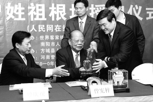 曾宪梓博士是在郑州参加中华曾姓祖根地授牌仪式时接受馈赠的。当省人大常委会副主任储亚平代表淮阳县人民政府赠送曾宪梓博士“伏羲圣尊”时,曾宪梓博士的脸色一下子变得肃穆起来,他面对圣像,双手合什,举于眉前,默默恭拜。并说:“淮阳是人文始祖伏羲长眠的地方,是人类文明的起源地,我一直都想去拜祭。等身体条件允许,我一定要去那里。伏羲是中华民族共同的祖先,请一尊‘伏羲’回家,我可以天天供奉,以不忘祖先功德。”本报记者 摄