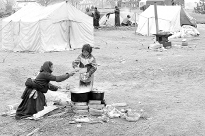 4月18日,灾区群众在一救护点烧水。 玉树地震造成大面积房屋倒塌,很多群众失去亲人、失去家园。然而,地震压不垮人们对生活的信心。目前,在青海玉树地震灾区,受灾群众积极自救,在大灾中坚强地生活下去。新华社记者 何俊昌 摄
